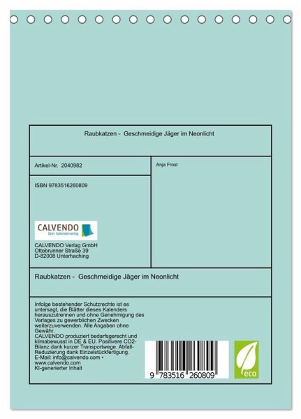 QUALITÄT - Hochwertiger Fotokalender mit 12 wunderschönen Motiven auf lichtbeständigem Bilderdruckpapier, robuste Spiralbindung.NACHHALTIG - deutliche Abfallreduzierung durch bedarfsgerechte Einzelstückfertigung, umweltfreundliches FSC-zertifiziertes Papier, Produktion in Deutschland, klimabewusste Logistik.PERFEKTES GESCHENK - Kalender für Freunde und Familie, für Kinder und Erwachsene, jung und alt, zu Weihnachten, Geburtstag oder zwischendurch.VIELFALT - Bildkalender in verschiedenen Formaten, z.B. DIN A5, DIN A4, DIN A3 sowie DIN A2. Ob Naturmotiv, Gemälde oder Fotos, ideal für ein persönliches Wohlfühlambiente.Magie der nächtlichen Raubkatzen in strahlendem Neonlicht von Autor(in): Anja Frost