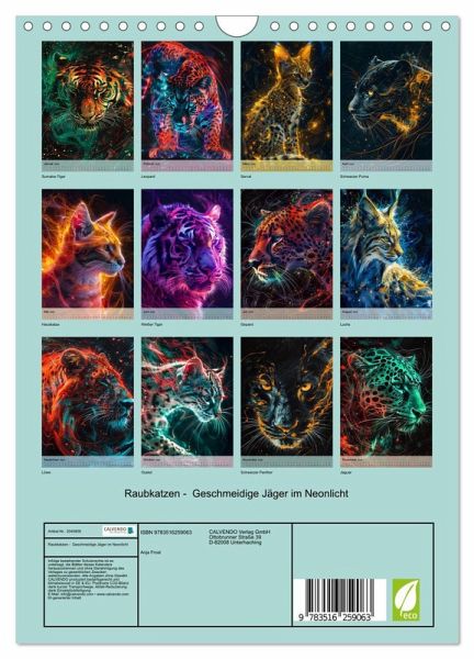 QUALITÄT - Hochwertiger Fotokalender mit 12 wunderschönen Motiven auf lichtbeständigem Bilderdruckpapier, robuste Spiralbindung mit Aufhängebügel.NACHHALTIG - deutliche Abfallreduzierung durch bedarfsgerechte Einzelstückfertigung, umweltfreundliches FSC-zertifiziertes Papier, Produktion in Deutschland, klimabewusste Logistik.PERFEKTES GESCHENK - Kalender für Freunde und Familie, für Kinder und Erwachsene, jung und alt, zu Weihnachten, Geburtstag oder zwischendurch.VIELFALT - Bildkalender in verschiedenen Formaten, z.B. DIN A5, DIN A4, DIN A3 sowie DIN A2. Ob Naturmotiv, Gemälde oder Fotos, ideal für ein persönliches Wohlfühlambiente.Magie der nächtlichen Raubkatzen in strahlendem Neonlicht von Autor(in): Anja Frost