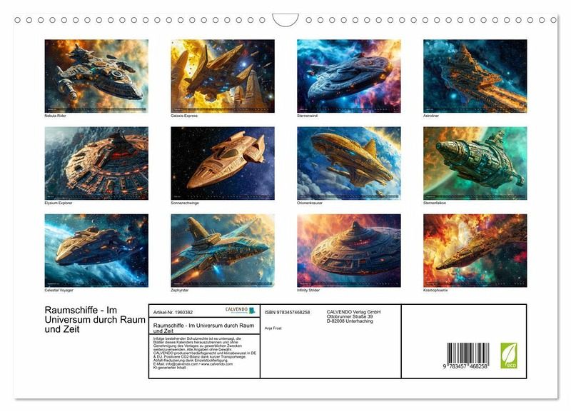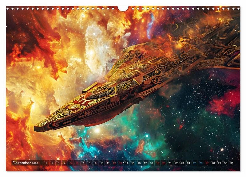 Entdecken Sie mit dem Kalender "Raumschiffe - Im Universum durch Raum und Zeit" faszinierende Visionen futuristischer Raumfahrzeuge. Tauchen Sie ein in die atemberaubende KI-generierte Welt der intergalaktischen Reisen und lassen Sie sich von diesem einzigartigen Geschenk für Weltraum-Enthusiasten verzaubern. Jeder Monat enthüllt ein neues meisterhaft gestaltetes Raumschiff, das die Vorstellungskraft anregt und die Schönheit des Universums einfängt.