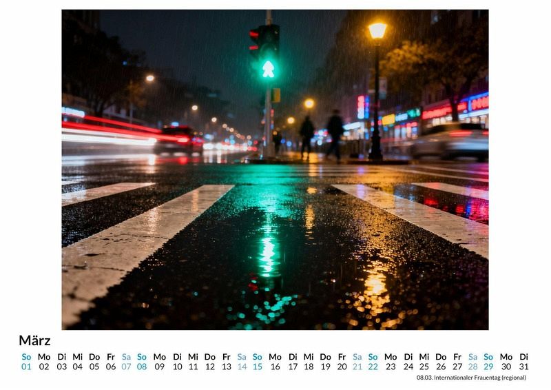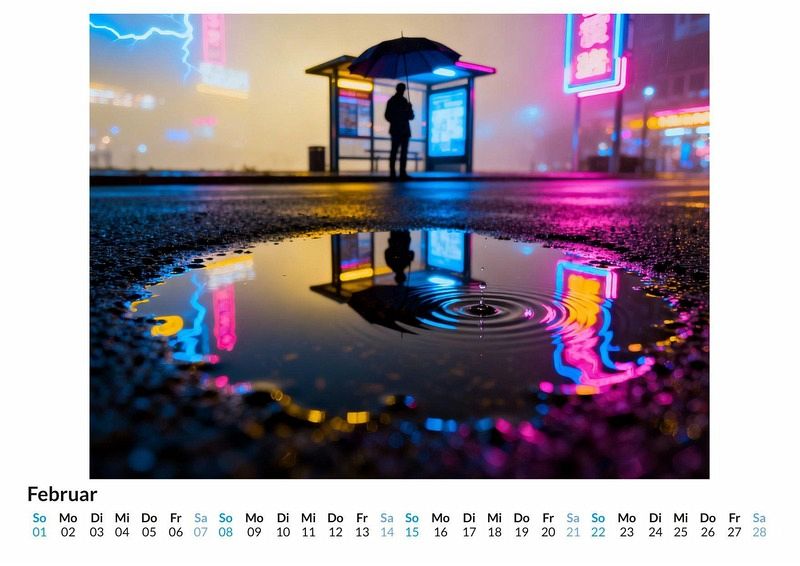Wenn die Nacht über die Metropole hereinbricht und der Regen die Straßen in spiegelnde Leinwände verwandelt, entsteht eine ganz eigene Poesie. Der Kalender "Reflexionen im Regen" fängt genau diese flüchtigen Momente ein, in denen die Lichter der Stadt auf nassem Asphalt tanzen und die Konturen der Welt in einem sanften Schleier verschwimmen. Dieser Kalender ist eine passende Wahl für: * Liebhaber nächtlicher Stadtlandschaften und urbaner Ästhetik. * Menschen, die die besondere Stimmung verregneter Nächte schätzen. * Alle, die eine unkonventionelle und stimmungsvolle Wanddekoration suchen. Jeder Monat enthüllt eine neue Szenerie, in der Neonreklamen zu farbenprächtigen Schlieren zerfließen und die Scheinwerfer von Autos geheimnisvolle Pfade in die Dunkelheit zeichnen. Die Bilder zeigen die Stadt aus einer Perspektive, die oft übersehen wird, voller Melancholie und stiller Schönheit. Jedes Motiv wurde durch eine einzigartige Synthese aus menschlicher Vision und digitaler Schöpfungskraft erschaffen und lädt dazu ein, die vertraute urbane Umgebung mit anderen Augen zu sehen. Beim Kauf dieses Kalenders kann man Folgendes erwarten: * Zwölf Monatsmotive, die die Magie regennasser Großstädte einfangen. * Ein übersichtliches Kalendarium, das die Organisation des Alltags begleitet. * Eine visuelle Reise durch leuchtende Metropolen im Wandel der Monate. Dieser Kalender ist eine Hommage an die verborgene Schönheit urbaner Nächte und ein Begleiter für das ganze Jahr. Die zwölf Kompositionen regen zum Innehalten an und zeigen die Stadt in einem Licht, das nur der Regen enthüllen kann. Es lohnt sich, einen Blick auf die Monatsansichten zu werfen und die besondere Atmosphäre der Bilder zu entdecken.