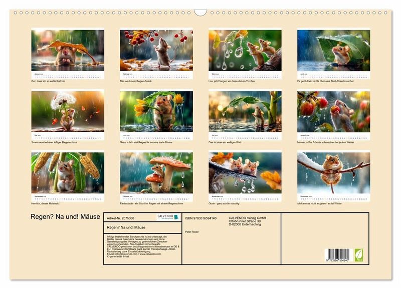Ob Niesel, Platzregen oder Eisgraupel - unsere kleinen pelzigen Helden lassen sich vom Wetter nicht die Laune verderben. Monat für Monat zeigen sie, wie niedlich, einfallsreich und einfach bezaubernd Regen sein kann. In zwölf liebevoll gestalteten KI-Bildern trotzen sie dem Regen mit jeder Menge Humor, Kreativität und einem großen Herzen. Da wird ein Blatt zur Strandmuschel, ein Pilz zum Regenschirm, und selbst ein Zweig bei Eisregen zur Mutprobe mit Charme. Ob Regentropfenfangen unter Blättern oder gemütliches Sitzen im Pilz-Unterschlupf - diese Mäuse zeigen: Regen ist nicht nur nass, sondern auch richtig lustig. Ein ideales Geschenk für alle, die sich nicht vom Wetter die Stimmung vermiesen lassen - oder es lernen möchten.