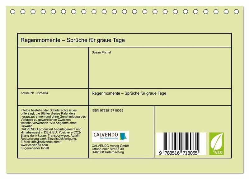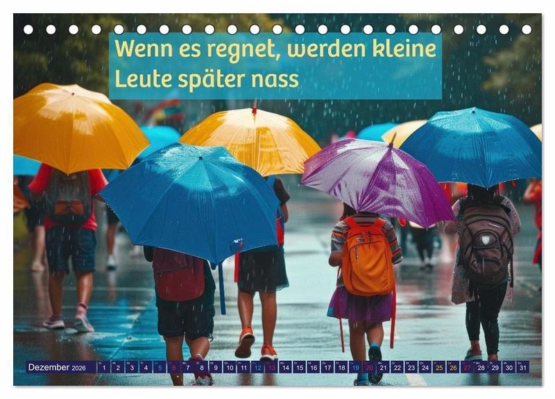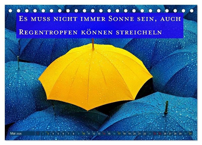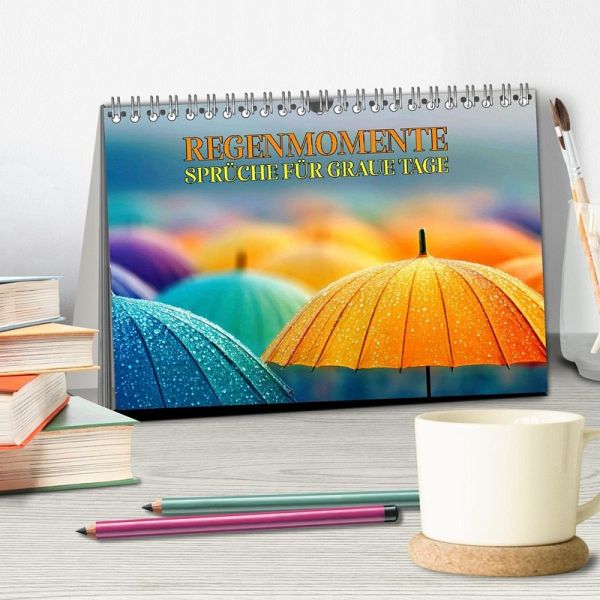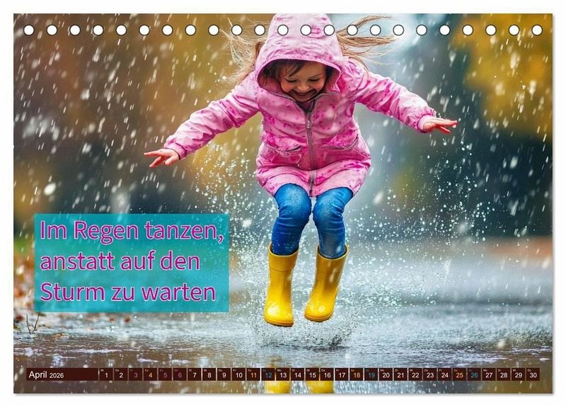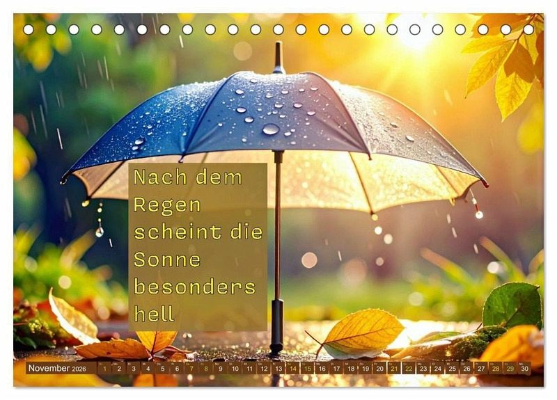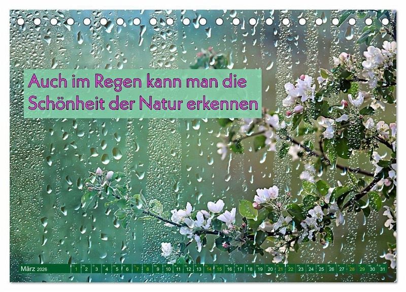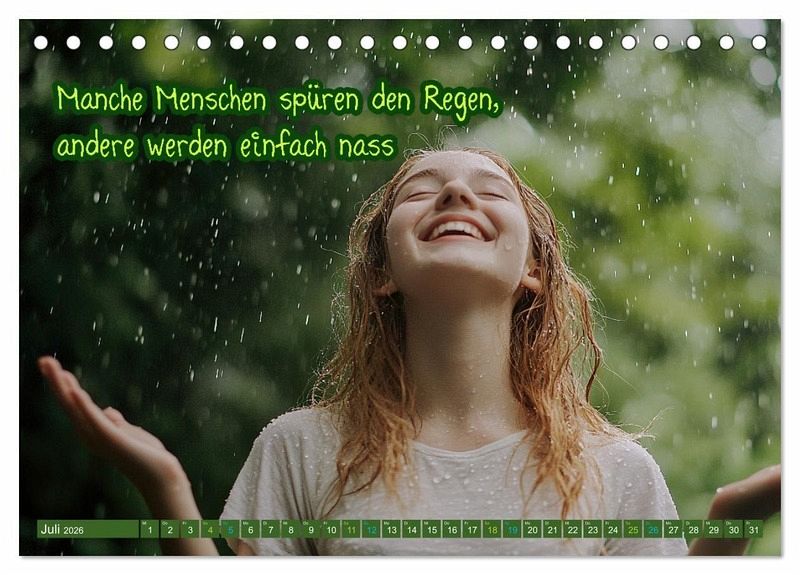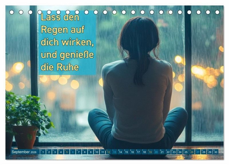 Dieser Kalender ist dein Begleiter durch das Jahr, mit stimmungsvollen Regenmotiven und inspirierenden Worten, die daran erinnern, dass selbst trübe Tage ihre eigene Magie haben.