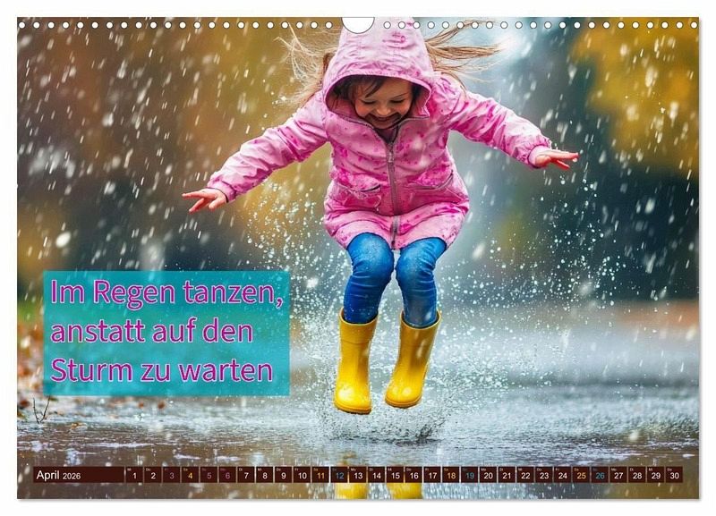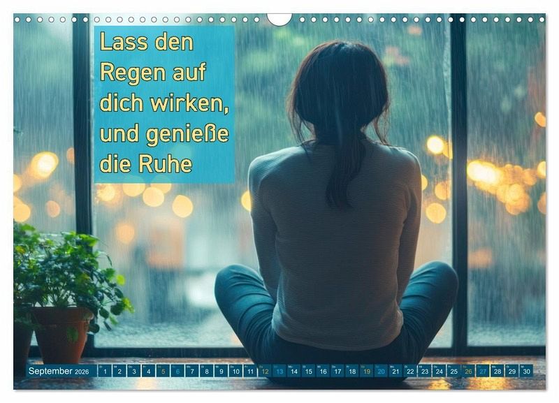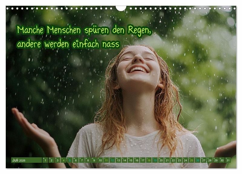 Dieser Kalender ist dein Begleiter durch das Jahr, mit stimmungsvollen Regenmotiven und inspirierenden Worten, die daran erinnern, dass selbst trübe Tage ihre eigene Magie haben.