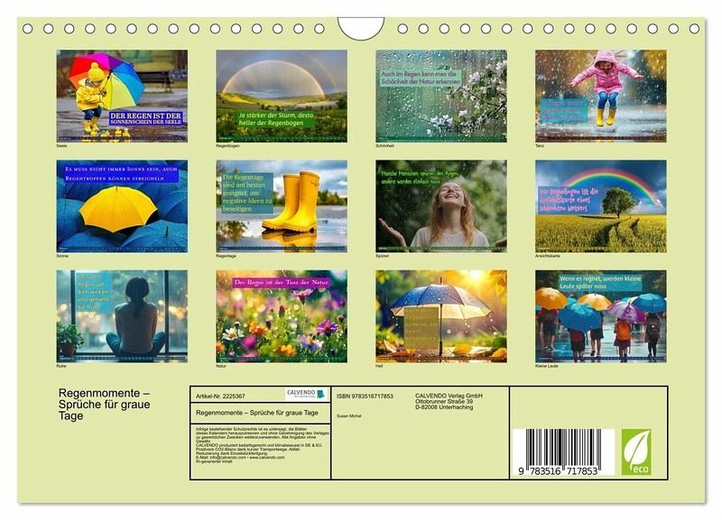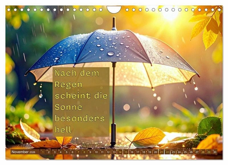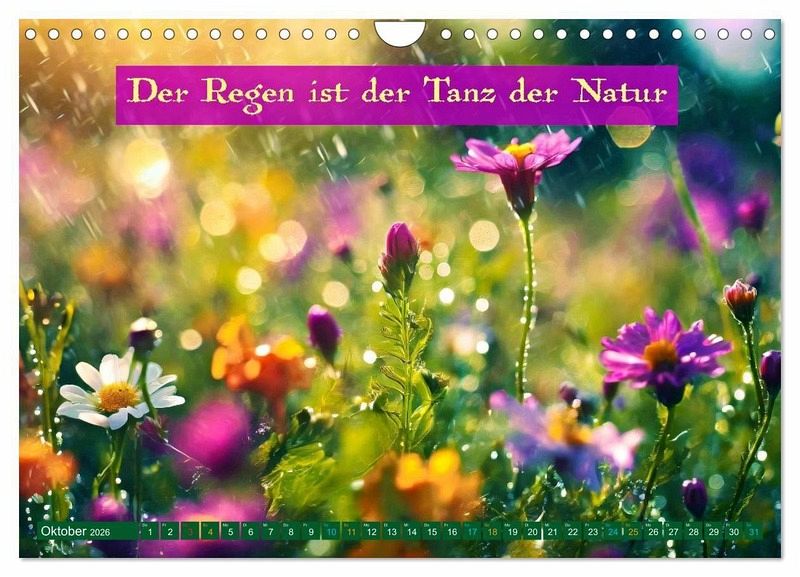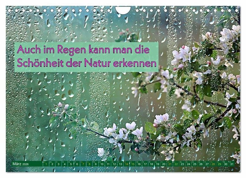 Dieser Kalender ist dein Begleiter durch das Jahr, mit stimmungsvollen Regenmotiven und inspirierenden Worten, die daran erinnern, dass selbst trübe Tage ihre eigene Magie haben.