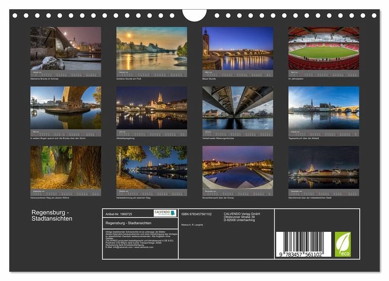 In diesem Kalender stellt der Photograph Markus Langlotz seine Heimatstadt Regensburg in monumentalen, großformatigen Photogemälden in technischer Perfektion vor. Die Perspektiven und Lichtstimmungen bieten eine außergewöhnliche Sicht auf eine außergewöhnliche Stadt.