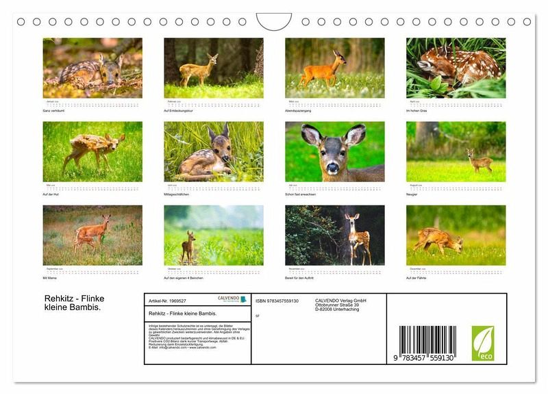 Bei dem Anblick eines Rehkitz hält jeder inne und genießt den Anblick eines so niedlichen und kleinen Wesen. Die jungen Reh sind teils noch so unbeholfen, aber sobald sie auf den Beinen sind lernen sie flink und mutig zu sein. Dieser Kalender zeigt 12 unvergessliche Aufnahmen der niedlichen Rehkitz.