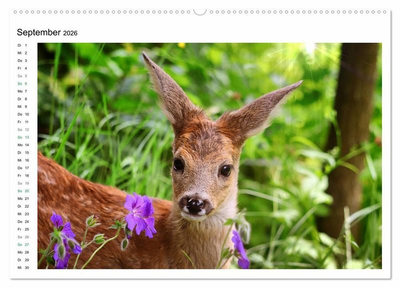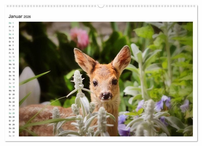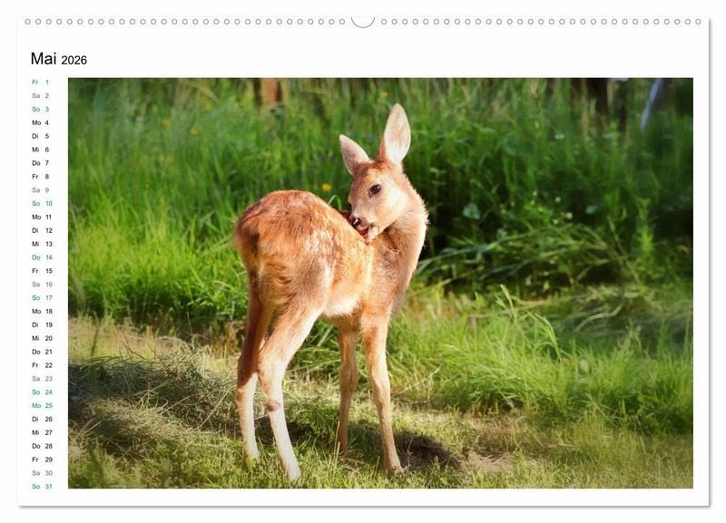 Rehe, die "Wildtiere des Jahres 2019", bringen im Wonnemonat Mai ihre Kitze zur Welt, niedliche Tierkinder mit großen Augen, zum Verlieben süß. Die Fotografin hat sich als Rehkitzretterin betätigt und ein durch einen Hundebiss verletztes Rehkitz aufgezogen. Wunderschöne Aufnahmen entstanden in ihrem Garten, die Sie jeden Monat aufs Neue erfreuen werden.