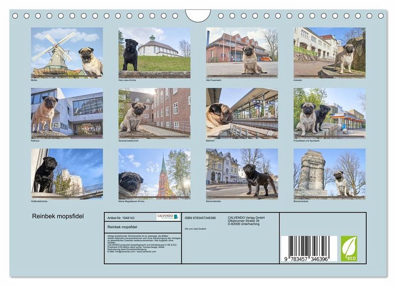 Entdecke das charmante Reinbek im Sachsenwald auf eine ganz besondere Art und Weise - mit unserem einzigartigen Mops-Kalender! Jeden Monat begleitet dich ein liebenswerter Mops vor einer malerischen Kulisse, durch die historischen Sehenswürdigkeiten dieser zauberhaften Stadt.