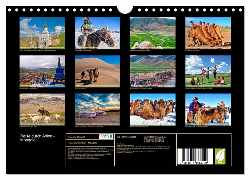 Für diesen Kalender hat der Fotokünstler Peter Roder eindrucksvolle Aufnahmen des asiatischen Landes Mongolei zusammengestellt und gestaltet, ein schöner Begleiter für das ganze Jahr.