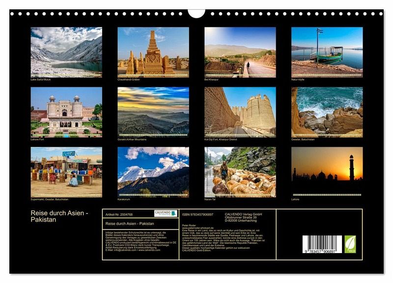 Eine Reise in ein Land, das so reich an Kultur und Geschichte ist, mit einem Volk, das so stolz auf seine Identität und sein Erbe ist. Eine Reise in faszinierende Städte wie Quetta, Peshawar und Lahore, die ein unbeschreibbares Flair ausstrahlen, könnte eine Zeitreise zurück in den Orient vor 100 Jahren sein. Wäre da nicht auch die Aussage, "Pakistan ist das gefährlichste Land der Welt". Die Islamische Republik Pakistan, Vielvölkerstaat und Land der Extreme. Dieser qualitativ hochwertige Kalender gehört zur exklusiven CALVENDO Gold-Edition.