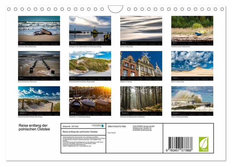 Kommen Sie mit auf eine Reise entlang der polnischen Ostseeküste! Vom Gebiet des alten Pommern mit der Stadt Kolobrzeg (Kolberg) bis nach Danzig an der Danziger Bucht gibt es viele schöne Landschaften und Orte zu entdecken. Dieser außergewöhnliche Kalender nimmt Sie ein Jahr lang mit an die schönsten Orte der polnischen Ostseeküste