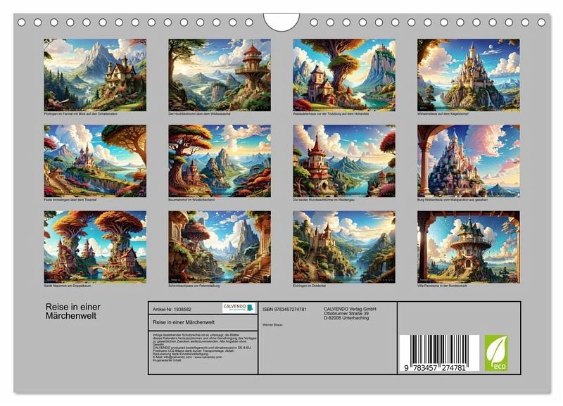 Dieser einzigartige Bildkalender entführt uns auf eine Reise durch ein zauberhaftes Märchenland. Lassen wir uns verzaubern von zwölf atemberaubenden Landschaften, die unsere Fantasie beflügeln und die mit Unterstützung von künstlicher Intelligenz entstanden sind. Auf dem Weg begegnen wir geheimnisvollen Burgen, malerischen Dörfern und verwunschenen Wäldern, wie auch mächtigen Gebirgen, die uns jeden Monat aufs Neue in Staunen versetzen können. Wir holen mit diesem Kalender einen Hauch von Magie in unser Zuhause.