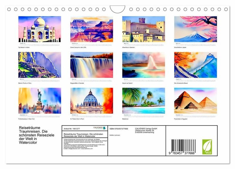 QUALITÄT - Hochwertiger Fotokalender mit 12 wunderschönen Motiven auf lichtbeständigem Bilderdruckpapier, robuste Spiralbindung mit Aufhängebügel.NACHHALTIG - deutliche Abfallreduzierung durch bedarfsgerechte Einzelstückfertigung, umweltfreundliches FSC-zertifiziertes Papier, Produktion in Deutschland, klimabewusste Logistik.PERFEKTES GESCHENK - Kalender für Freunde und Familie, für Kinder und Erwachsene, jung und alt, zu Weihnachten, Geburtstag oder zwischendurch.VIELFALT - Bildkalender in verschiedenen Formaten, z.B. DIN A5, DIN A4, DIN A3 sowie DIN A2. Ob Naturmotiv, Gemälde oder Fotos, ideal für ein persönliches Wohlfühlambiente.Sehnsuchts-Reiseziele auf der Welt zum Dahinträumen von Autor(in): Steffani Lehmann