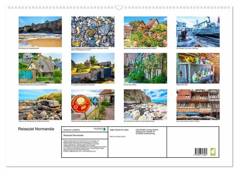 QUALITÄT - Hochwertiger Fotokalender mit 12 wunderschönen Motiven auf lichtbeständigem Bilderdruckpapier, robuste Spiralbindung mit Aufhängebügel.NACHHALTIG - deutliche Abfallreduzierung durch bedarfsgerechte Einzelstückfertigung, umweltfreundliches FSC-zertifiziertes Papier, Produktion in Deutschland, klimabewusste Logistik.PERFEKTES GESCHENK - Kalender für Freunde und Familie, für Kinder und Erwachsene, jung und alt, zu Weihnachten, Geburtstag oder zwischendurch.VIELFALT - Bildkalender in verschiedenen Formaten, z.B. DIN A5, DIN A4, DIN A3 sowie DIN A2. Ob Naturmotiv, Gemälde oder Fotos, ideal für ein persönliches Wohlfühlambiente.Mein Reiseziel Normandie verführt mit malerischen Motiven. von Autor(in): Klaus Scholz