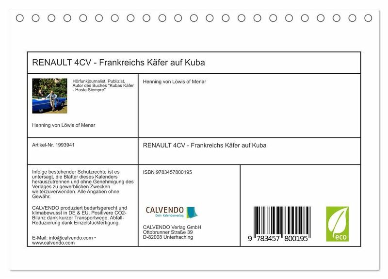 QUALITÄT - Hochwertiger Fotokalender mit 12 wunderschönen Motiven auf lichtbeständigem Bilderdruckpapier, robuste Spiralbindung.NACHHALTIG - deutliche Abfallreduzierung durch bedarfsgerechte Einzelstückfertigung, umweltfreundliches FSC-zertifiziertes Papier, Produktion in Deutschland, klimabewusste Logistik.PERFEKTES GESCHENK - Kalender für Freunde und Familie, für Kinder und Erwachsene, jung und alt, zu Weihnachten, Geburtstag oder zwischendurch.VIELFALT - Bildkalender in verschiedenen Formaten, z.B. DIN A5, DIN A4, DIN A3 sowie DIN A2. Ob Naturmotiv, Gemälde oder Fotos, ideal für ein persönliches Wohlfühlambiente.Der französische Oldtimer RENAULT 4CV auf Kuba von Autor(in): Henning von Loewis of Menar