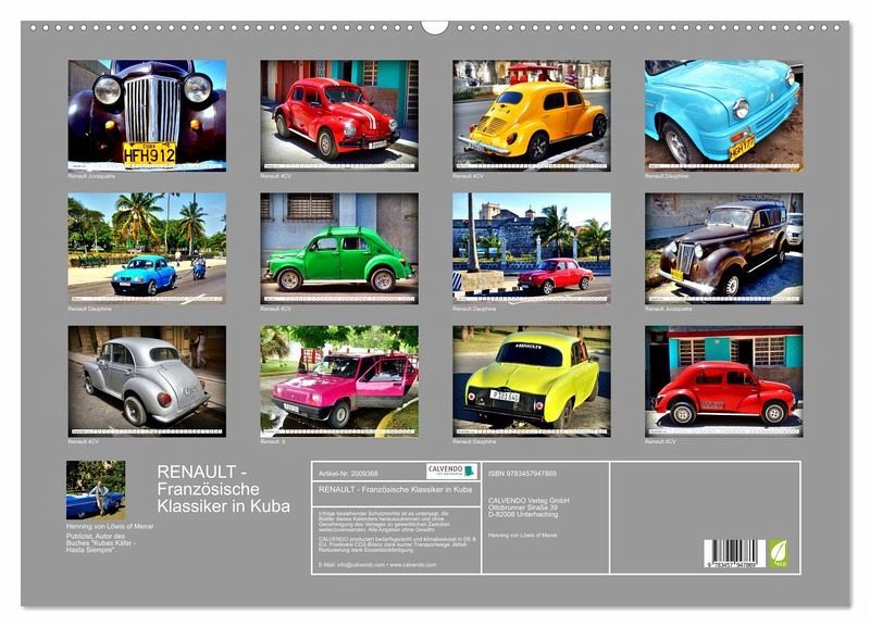 QUALITÄT - Hochwertiger Fotokalender mit 12 wunderschönen Motiven auf lichtbeständigem Bilderdruckpapier, robuste Spiralbindung mit Aufhängebügel.NACHHALTIG - deutliche Abfallreduzierung durch bedarfsgerechte Einzelstückfertigung, umweltfreundliches FSC-zertifiziertes Papier, Produktion in Deutschland, klimabewusste Logistik.PERFEKTES GESCHENK - Kalender für Freunde und Familie, für Kinder und Erwachsene, jung und alt, zu Weihnachten, Geburtstag oder zwischendurch.VIELFALT - Bildkalender in verschiedenen Formaten, z.B. DIN A5, DIN A4, DIN A3 sowie DIN A2. Ob Naturmotiv, Gemälde oder Fotos, ideal für ein persönliches Wohlfühlambiente.Oldtimer von Renault auf Kuba von Autor(in): Henning von Loewis of Menar