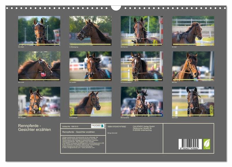 QUALITÄT - Hochwertiger Fotokalender mit 12 wunderschönen Motiven auf lichtbeständigem Bilderdruckpapier, robuste Spiralbindung mit Aufhängebügel.NACHHALTIG - deutliche Abfallreduzierung durch bedarfsgerechte Einzelstückfertigung, umweltfreundliches FSC-zertifiziertes Papier, Produktion in Deutschland, klimabewusste Logistik.PERFEKTES GESCHENK - Kalender für Freunde und Familie, für Kinder und Erwachsene, jung und alt, zu Weihnachten, Geburtstag oder zwischendurch.VIELFALT - Bildkalenderin verschiedenen Formaten, z.B. DIN A5, DIN A4, DIN A3 sowie DIN A2. Ob Naturmotiv, Gemälde oder Fotos, ideal für ein persönliches Wohlfühlambiente.Anmutige Portraits edler Vollblüter auf der Rennbahn von Autor(in): Brinja Schmidt
