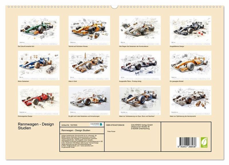 Geschwindigkeit beginnt mit einer Idee - und dieser Kalender zeigt den Moment, in dem Visionen auf Papier Gestalt annehmen. Jedes grandiose KI-Bild präsentiert einen einzigartigen Rennwagen, dessen Design mal futuristisch, mal revolutionär erscheint. Jedes Fahrzeug wirkt wie für eine ganz besondere Rennklasse geschaffen - aerodynamisch, kraftvoll, bis ins Detail durchdacht und mit einem Hauch von Science Fiction. Doch der wahre Reiz liegt in den Details: Um jeden Rennwagen herum sind Bleistift-Skizzen zu sehen, als wären die Konstrukteure noch mitten im kreativen Prozess. Ergänzt durch Notizen und Anmerkungen wirkt es, als hätte man einen Blick direkt in das Skizzenbuch eines Designers geworfen. Ein Muss für alle, die sich für Motorsport, Design und Ingenieurskunst begeistern.
