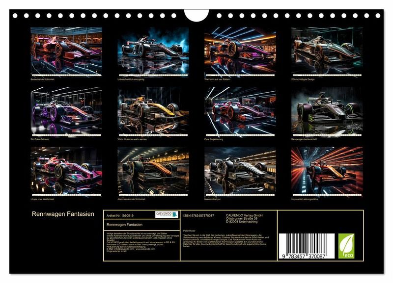 Tauchen Sie ein in die Welt der modernen, zukunftsweisenden Rennwagen, die Spitzenleistung neu definieren können. Erleben Sie atemberaubende Schönheiten und beeindruckende, stromlinienförmige Designs. Der Fotokünstler Peter Roder hat großartige KI-Bilder von spektakulären Rennwagen gestaltet. Ein wunderschöner Kalender für alle, die eine Leidenschaft für Geschwindigkeit und superschöne Autos haben.