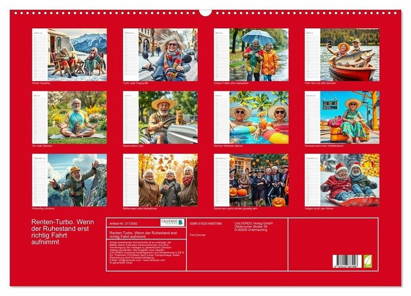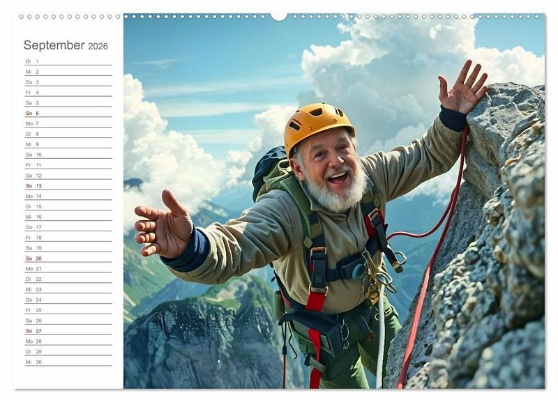 Dieser Kalender zeigt humorvolle und actionreiche Szenen älterer Damen und Herren, die voller Energie durchs Leben gehen. Von Schlittenfahrt bis Poolparty, hier wird der Ruhestand neu definiert. Die originellen Bilder wurden mit Künstlicher Intelligenz generiert und sorgen für gute Laune das ganze Jahr über. Ein ideales Geschenk für alle, die zeigen wollen: Alt sein heißt nicht stillstehen.