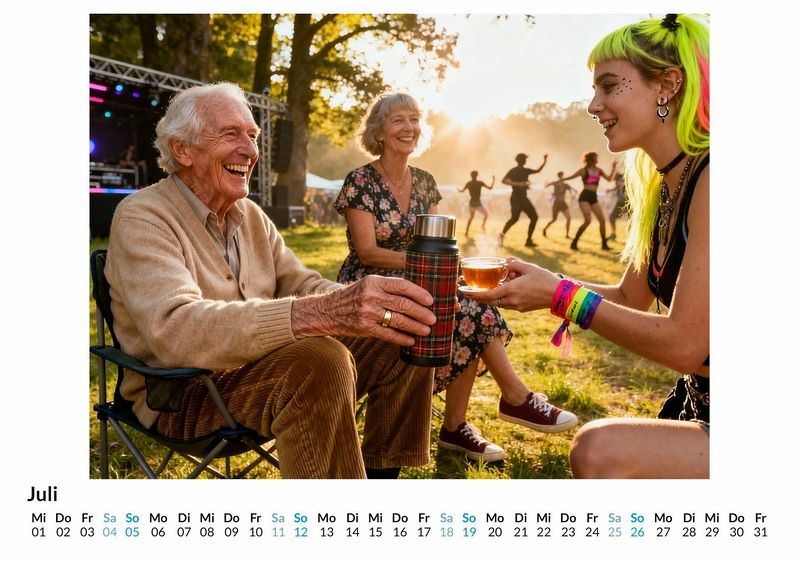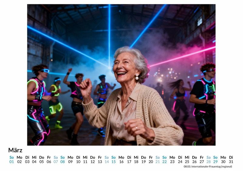 Was passiert, wenn Strickjacke auf Stroboskop und Lebenserfahrung auf wummernde Bässe trifft? Der Kalender "Rentner auf Technoparty" fängt genau diesen Moment ein und präsentiert eine Fotoserie, die das pure visuelle Vergnügen zeigt, Senioren ausgelassen zwischen jungen Ravern tanzen zu sehen. Dieser Kalender ist eine ausgezeichnete Wahl: * Für alle, die das Unerwartete lieben und einen Sinn für humorvolle Kontraste haben. * Für Liebhaber der elektronischen Musik, die die Szene mit einem Augenzwinkern betrachten. * Für Suchende nach einem originellen Geschenk, das garantiert für Gesprächsstoff sorgt. Jedes Monatsblatt zeigt eine neue Szene voller Energie und Lebensfreude. Diese einzigartigen Bildkompositionen wurden durch das Zusammenspiel von menschlicher Idee und digitaler Schöpfungskraft zum Leben erweckt. Die Fotoserie dokumentiert Senioren in ihrer Alltagskleidung, die sich ganz natürlich zwischen der tanzenden Menge bewegen. Es entsteht ein Bilderreigen, der Generationen verbindet und zum Schmunzeln anregt. Mit dem Kauf dieses Kalenders ist zu erwarten: * Zwölf Monatsmotive, die das ganze Jahr über begleiten. * Ein praktischer Jahresplaner im Wandkalenderformat. * Eine Sammlung von Fotografien, die gute Laune verbreiten. Der Kalender "Rentner auf Technoparty" ist mehr als nur ein Zeitmesser. Er ist eine Hommage an die Freude am Leben, die keine Altersgrenzen kennt. Eine Einladung, jeden Monat mit einem Lächeln zu beginnen.