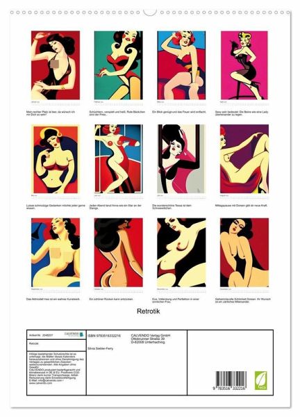 PREMIUM-LINIE - Brillanter Fotokalender mit 12 wunderschönen Motiven, Kunstdruck in Hochglanz in Museumsqualität.QUALITÄT - edle Materialien, stabile Rückwand mit 2 innovativen Einstecktaschen für eine optimale Präsentation an der Wand.NACHHALTIG - deutliche Abfallreduzierung durch bedarfsgerechte Einzelstückfertigung, umweltfreundliches FSC-zertifiziertes Papier, Produktion in Deutschland, klimabewusste Logistik.PERFEKTES GESCHENK - Kalender für Freunde und Familie, für Erwachsene, zu Weihnachten, Geburtstag oder zwischendurch.Retro-Erotik trifft auf Kunst. von Autor(in): Silvia Siebler-Ferry