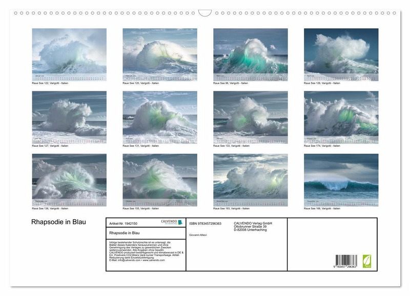 Tauchen Sie ein in den dramatischen Kalender "Rhapsodie in Blau" mit zwölf faszinierenden Fotos, die die turbulente Schönheit stürmischer Meereswellen einfangen. Tauchen Sie ein in die turbulente Symphonie der Natur, während jeder Monat die ständig wechselnden Stimmungen des kraftvollen und majestätischen blauen Meeres offenbart. Mit seinen wundervollen stürmischen Wellen, die der italienische Fotograf Giovanni Allievi eingefangen hat, ist dieser Kalender eine visuelle Hommage an die dynamische Energie und den wilden Reiz stürmischer Meereslandschaften. Bereiten Sie sich mit dieser atemberaubenden Kollektion darauf vor, den stimmungsvollen Geist des Meeres zu umarmen!