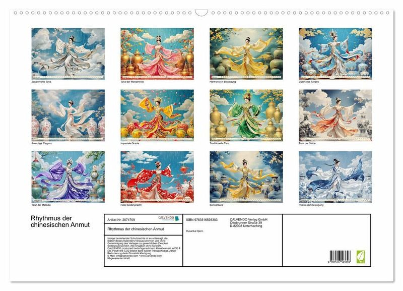 Dieser Kalender präsentiert atemberaubende Bilder von chinesischen Tänzerinnen in kunstvoll gestalteten, prachtvollen Kleidern, ein meisterhaftes Spiel aus Licht, Bewegung und Emotion. Jede Monatsseite enthüllt ein neues Kapitel der Eleganz und Schönheit, das nicht nur Ihren Blick fesselt, sondern auch Ihre Seele berührt. Lassen Sie sich von den harmonischen Rhythmen und den lebendigen Farben inspirieren. Dieser Kalender ist ein visueller Begleiter, der Ihren Alltag mit einem Hauch von Magie bereichert.