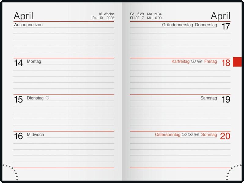 Blattgröße: 72 × 112 mm ? 2 Seiten = 1 Woche ? 224 Seiten, Druckfarbe Kalendarium: schwarz/rot ? 70 g/m², Klebebindung ? Textil-Einband, Farbe: mint ? Jahresübersicht Vorjahr und Folgejahr, 6 Seiten Monatsplan aktuelles Jahr, 6 Seiten Folgejahr, Ferientermine Deutschland, 32 Seiten Notizen blanko perforiert, 2 Seiten Namenstage, 23 Seiten Wissenswertes, 16 Seiten Landkarten, 32 Seiten Adressen mit Registerschnitt ? Eckperforation ? für Kalenderjahr 2026