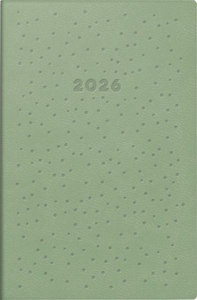 Blattgröße: 72 × 112 mm 2 Seiten = 1 Woche 224 Seiten, Druckfarbe Kalendarium: schwarz/rot 70 g/m², Klebebindung Kunstleder-Einband Trend, Farbe: grün Jahresübersicht Vorjahr und Folgejahr, 6 Seiten Monatsplan aktuelles Jahr, 6 Seiten Folgejahr, Ferientermine Deutschland, 32 Seiten Notizen blanko perforiert, 2 Seiten Namenstage, 23 Seiten Wissenswertes, 16 Seiten Landkarten, 32 Seiten Adressen mit Registerschnitt Eckperforation für Kalenderjahr 2026