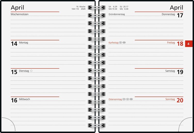 Blattgröße: 100 × 140 mm 2 Seiten = 1 Woche 160 Seiten, Druckfarbe Kalendarium: schwarz/rot 70 g/m², Wire-O-Bindung Glanzkarton-Umschlag, Farbe: goldfarben Jahresübersicht Vorjahr und Folgejahr, 6 Seiten Monatsplan aktuelles Jahr, 6 Seiten Folgejahr, Ferientermine Deutschland, 16 Seiten Notizen blanko, 2 Seiten Namenstage, 16 Seiten Wissenswertes Eckperforation für Kalenderjahr 2026