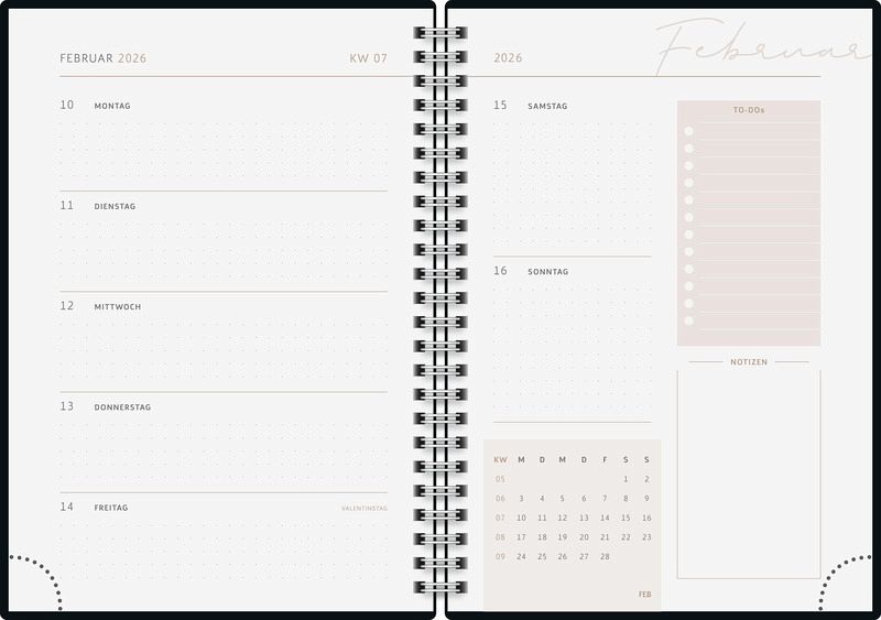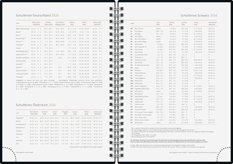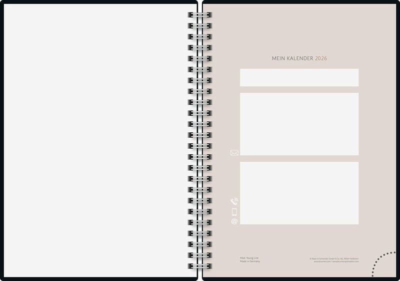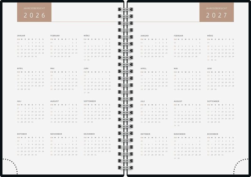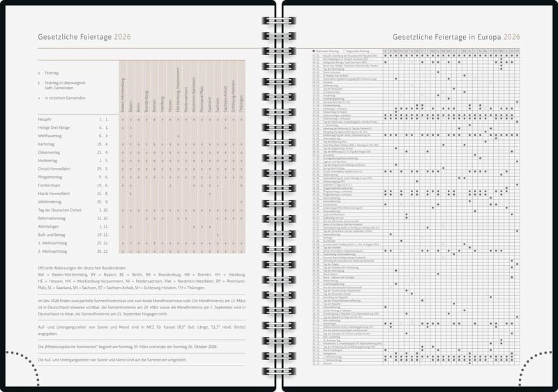 Blattgröße: 148 × 210 mm 2 Seiten = 1 Woche 160 Seiten, Druckfarbe Kalendarium: braun 90 g/m², Wire-O-Bindung Grafik-Einband, Farbe: bunt, goldfarbene Prägung Jahresübersicht aktuelles Jahr und Folgejahr, 12 Seiten Monatsplan aktuelles Jahr, 6 Seiten Folgejahr, Ferientermine Deutschland, Österreich und Schweiz, 16 Seiten Notizen Eckperforation für Kalenderjahr 2026