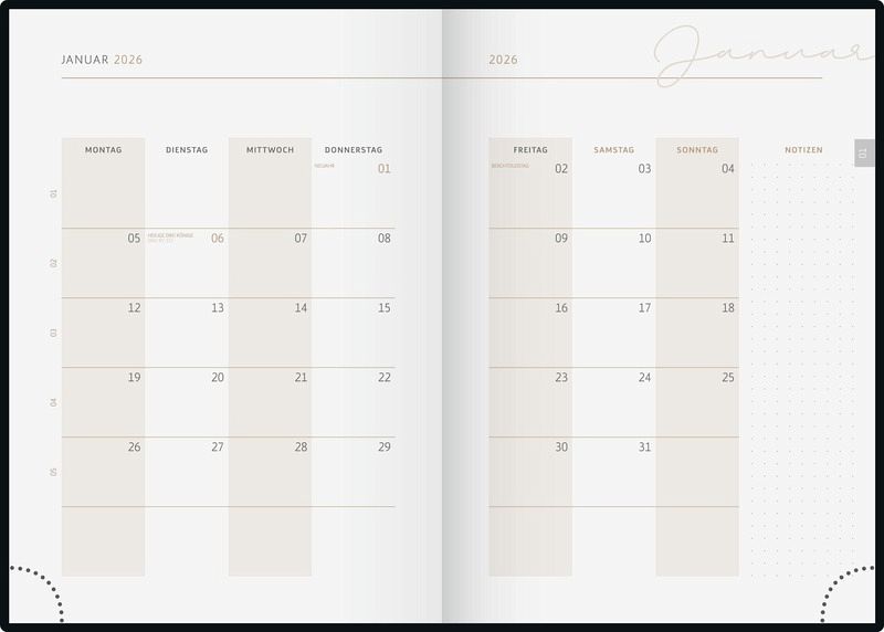 Blattgröße: 148 × 210 mm 1 Seite = 1 Tag 400 Seiten, Druckfarbe Kalendarium: braun 90 g/m², Klebebindung Grafik-Einband, Farbe: natur Jahresübersicht aktuelles Jahr und Folgejahr, 12 Seiten Monatsplan aktuelles Jahr, 6 Seiten Folgejahr, Ferientermine Deutschland, Österreich und Schweiz, 16 Seiten Notizen, tabellarische Monatsübersicht, Sonnenzeiten, Mondphasen Zeichenband für Kalenderjahr 2026