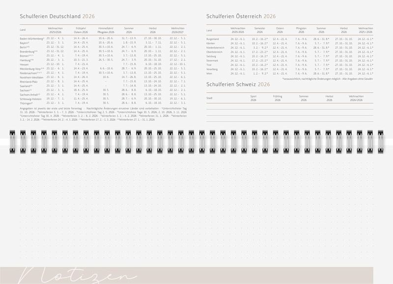 Blattgröße: 297 × 105 mm 2 Seiten = 1 Woche 128 Seiten, Druckfarbe Kalendarium: braun 90 g/m², Wire-O-Bindung Grafik-Einband, Softcover, flexibel, Farbe: schwarz, goldfarbene Prägung 12 Seiten Monatsplan aktuelles Jahr, Ferientermine Deutschland und Österreich, 2 Seiten Notizen, 4 Seiten Timetable für Kalenderjahr 2026
