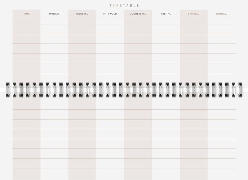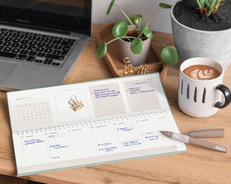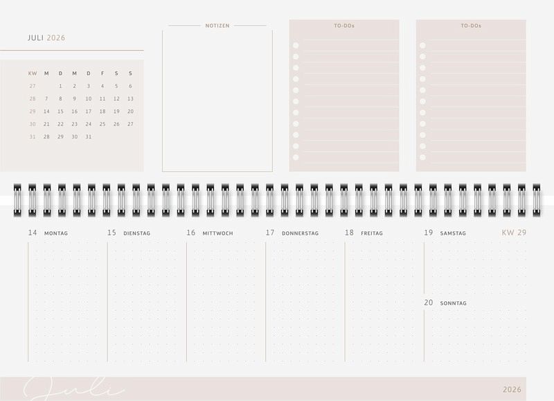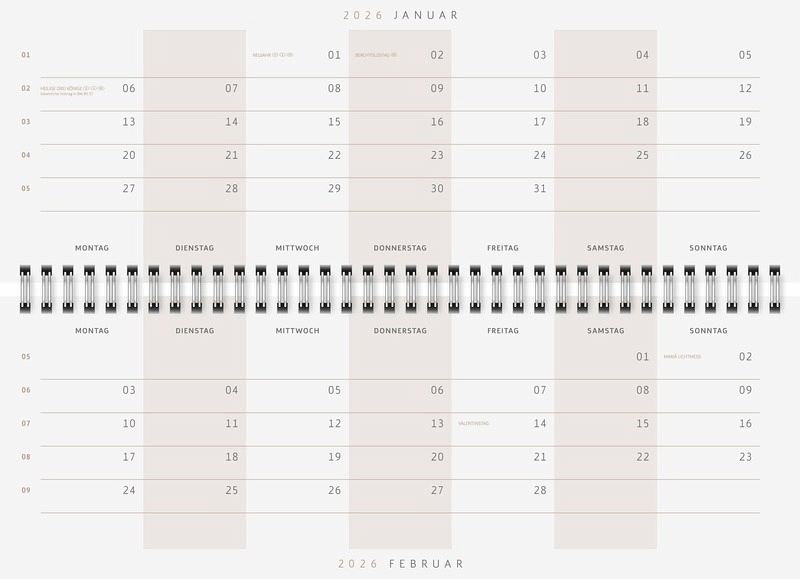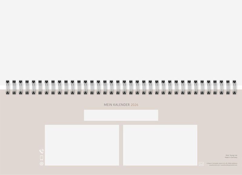 Blattgröße: 297 × 105 mm 2 Seiten = 1 Woche 128 Seiten, Druckfarbe Kalendarium: braun 90 g/m², Wire-O-Bindung Textil-Einband, Farbe: mint, goldfarbene und weiße Prägung 12 Seiten Monatsplan aktuelles Jahr, Ferientermine Deutschland und Österreich, 2 Seiten Notizen, 4 Seiten Timetable für Kalenderjahr 2026