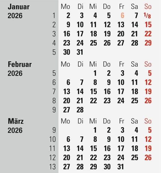durch Drehen verstellbares Kalendarium für 2 Jahre, jeweils 3 Monate im Sichtfeld B/H/T: 110 × 183 × 30 mm Blattgröße: 90 × 120 mm 1 Seite = 3 Monate Druckfarbe Kalendarium: schwarz/rot Farbe: schwarz Drehknopf: schwarz verschiebbarer Tagesanzeiger Kunststoff-Rahmen für Kalenderjahr 2026