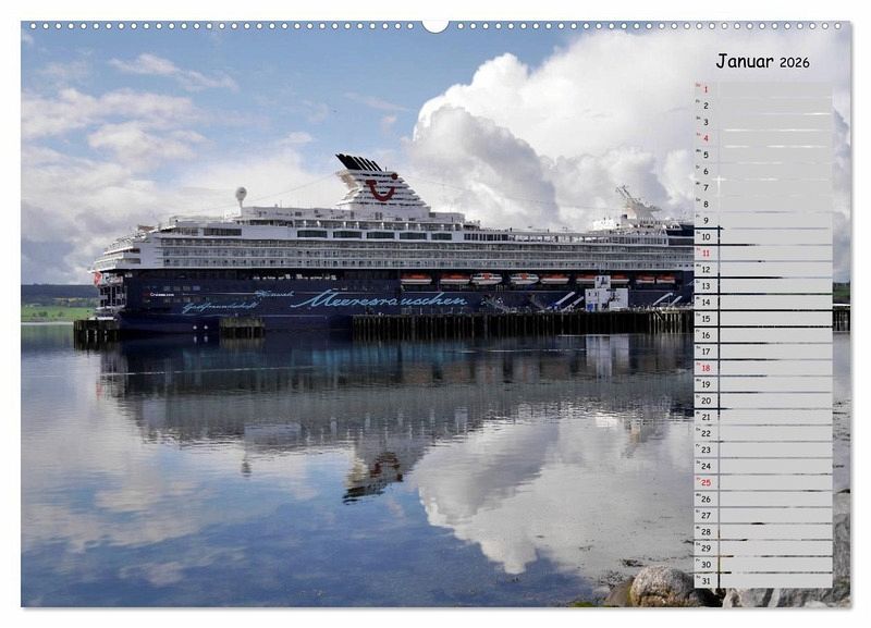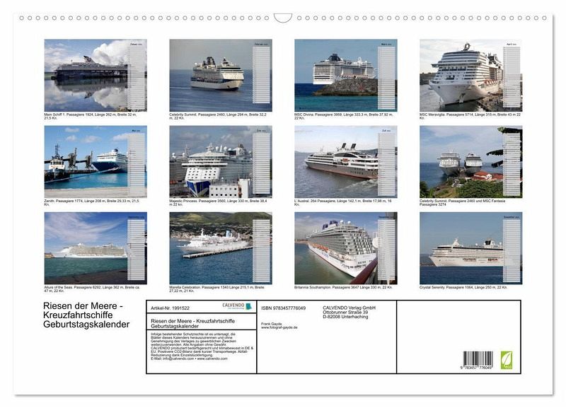 Ein perfekter Jahresbegleiter für jeden Liebhaber von Kreuzfahrten und Kreuzfahrtschiffen. Eine kalendarische Bilderserie der schönsten und größten Kreuzfahrtschiffe!