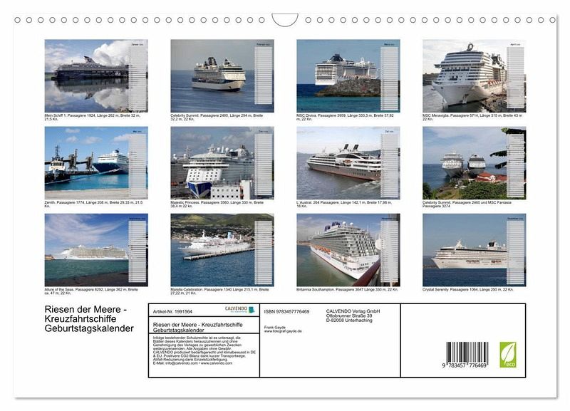 QUALITÄT - Hochwertiger Fotokalender mit 12 wunderschönen Motiven auf lichtbeständigem Bilderdruckpapier, robuste Spiralbindung mit Aufhängebügel.NACHHALTIG - deutliche Abfallreduzierung durch bedarfsgerechte Einzelstückfertigung, umweltfreundliches FSC-zertifiziertes Papier, Produktion in Deutschland, klimabewusste Logistik.PERFEKTES GESCHENK - Kalender für Freunde und Familie, für Kinder und Erwachsene, jung und alt, zu Weihnachten, Geburtstag oder zwischendurch.VIELFALT - Bildkalender in verschiedenen Formaten, z.B. DIN A5, DIN A4, DIN A3 sowie DIN A2. Ob Naturmotiv, Gemälde oder Fotos, ideal für ein persönliches Wohlfühlambiente.Die größten und schönsten Kreuzfahrtschiffe auf den Weltmeeren in einem Geburtstagskalender zusammengefasst von Autor(in): Frank Gayde