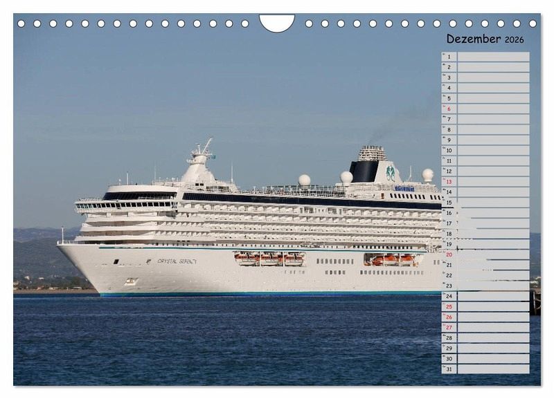 Ein perfekter Jahresbegleiter für jeden Liebhaber von Kreuzfahrten und Kreuzfahrtschiffen. Eine kalendarische Bilderserie der schönsten und größten Kreuzfahrtschiffe!