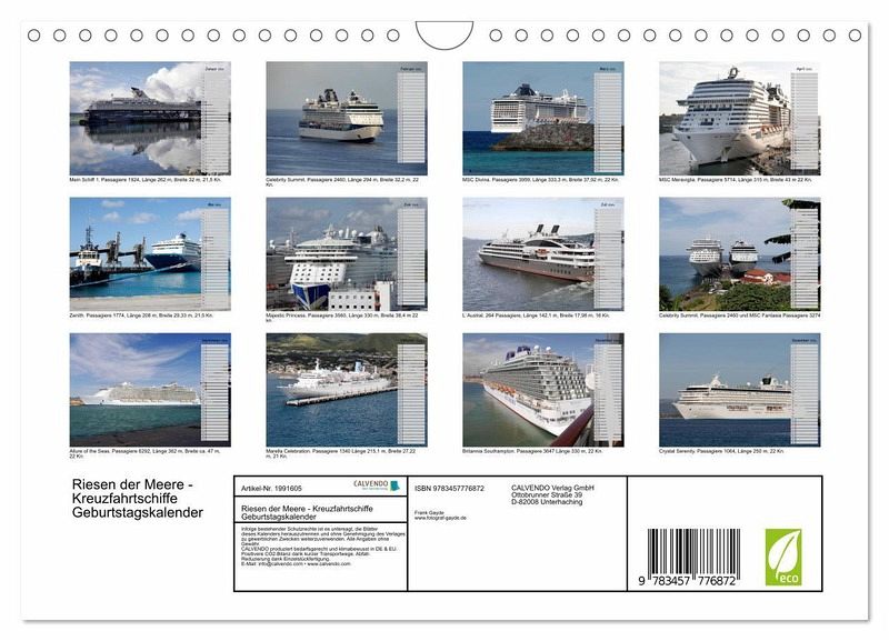 QUALITÄT - Hochwertiger Fotokalender mit 12 wunderschönen Motiven auf lichtbeständigem Bilderdruckpapier, robuste Spiralbindung mit Aufhängebügel.NACHHALTIG - deutliche Abfallreduzierung durch bedarfsgerechte Einzelstückfertigung, umweltfreundliches FSC-zertifiziertes Papier, Produktion in Deutschland, klimabewusste Logistik.PERFEKTES GESCHENK - Kalender für Freunde und Familie, für Kinder und Erwachsene, jung und alt, zu Weihnachten, Geburtstag oder zwischendurch.VIELFALT - Bildkalender in verschiedenen Formaten, z.B. DIN A5, DIN A4, DIN A3 sowie DIN A2. Ob Naturmotiv, Gemälde oder Fotos, ideal für ein persönliches Wohlfühlambiente.Die größten und schönsten Kreuzfahrtschiffe auf den Weltmeeren in einem Geburtstagskalender zusammengefasst von Autor(in): Frank Gayde