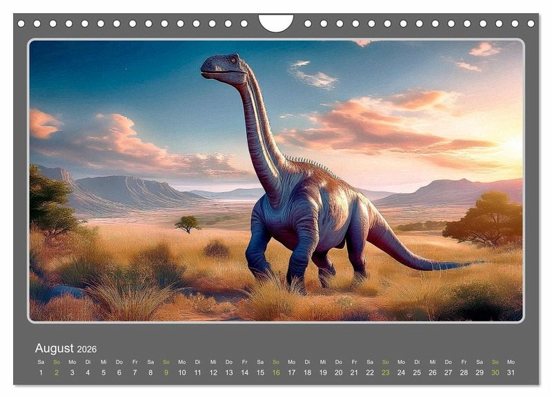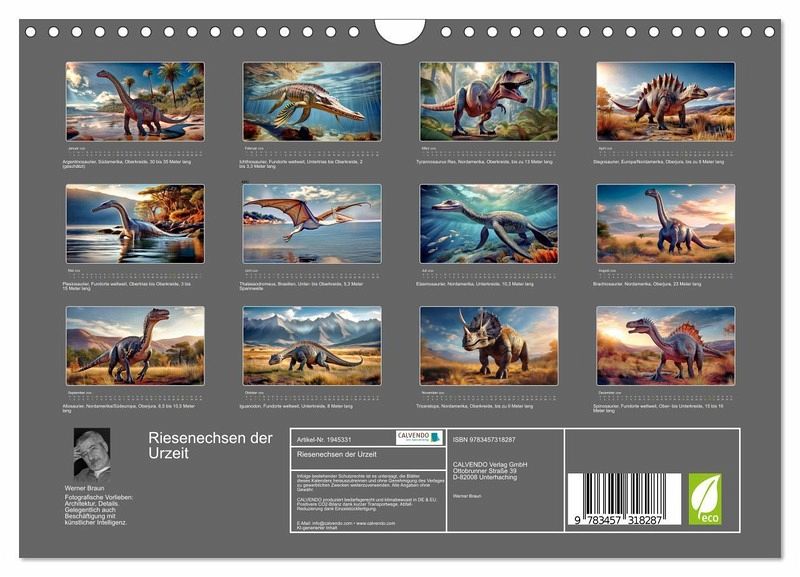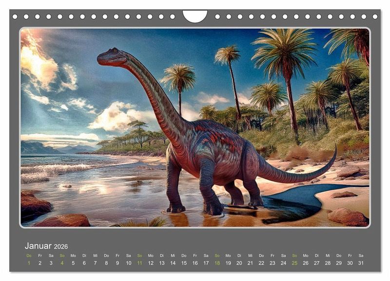 Entdecken Sie die faszinierende Welt der Saurier mit diesem einzigartigen Kalender! Tauchen Sie ein in eine lange vergangene Zeit, in der majestätische Kreaturen wie der mächtige Tyrannosaurus Rex, der beeindruckende Brachiosaurus und der massige Triceratops die Erde bevölkerten. Mit Unterstützung der künstlichen Intelligenz präsentiert jeder Monat ein beeindruckendes Bild dieser urzeitlichen Giganten, das Ihnen die Vielfalt und Einzigartigkeit der Saurier vor Augen führt. Erleben Sie die Vielfalt der Riesenechsen in unvergesslichen Illustrationen. Dieser Kalender ist ein Muss für Saurier-Fans und stellt nicht nur die beeindruckenden Kreaturen dar, sondern vermittelt den Eindruck vom faszinierendes Leben auf unserem Planeten lange vor unserer Zeit.