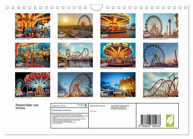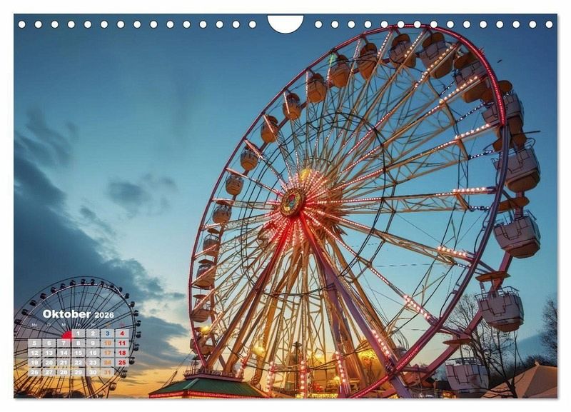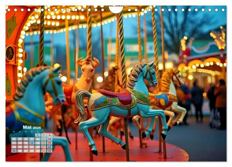 Ein Jahr voller Lichter, Lachen und Luftsprünge, der Kalender für alle, die das Kirmesgefühl lieben. Mit jedem Blatt ein neues Fahrgeschäft, ein neues Abenteuer, ein neuer Blick auf ein Riesenrad. Willkommen im Jahrmarkt der Träume. Dieser Kalender entführt dich Monat für Monat in eine Welt voller Magie, Musik und fliegender Karussells. Der Inhalt wurde mit Hilfe von KI erstellt.