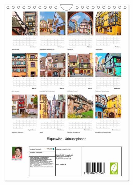 QUALITÄT - Hochwertiger Fotokalender mit 12 wunderschönen Motiven auf lichtbeständigem Bilderdruckpapier, robuste Spiralbindung mit Aufhängebügel.NACHHALTIG - deutliche Abfallreduzierung durch bedarfsgerechte Einzelstückfertigung, umweltfreundliches FSC-zertifiziertes Papier, Produktion in Deutschland, klimabewusste Logistik.PERFEKTES GESCHENK - Kalender für Freunde und Familie, für Kinder und Erwachsene, jung und alt, zu Weihnachten, Geburtstag oder zwischendurch.VIELFALT - Bildkalender in verschiedenen Formaten,z.B. DIN A5, DIN A4, DIN A3 sowie DIN A2. Ob Naturmotiv, Gemälde oder Fotos, ideal für ein persönliches Wohlfühlambiente.Im Osten Frankreichs, wenige Kilometer von Colmar liegt die mittelalterliche Siedlung Riquewihr. von Autor(in): Nina Schwarze