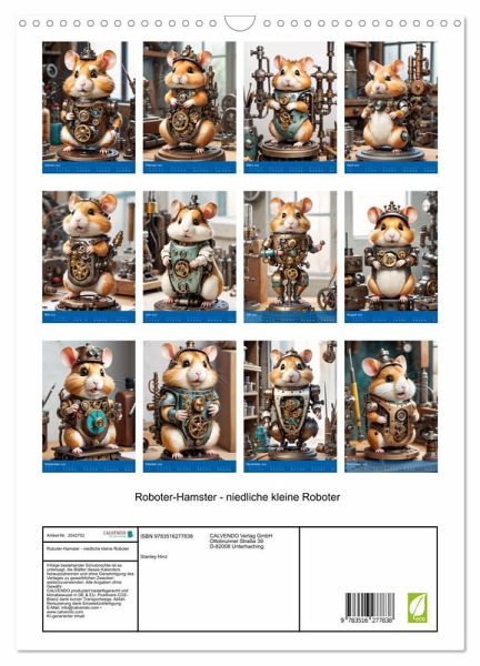 QUALITÄT - Hochwertiger Fotokalender mit 12 wunderschönen Motiven auf lichtbeständigem Bilderdruckpapier, robuste Spiralbindung mit Aufhängebügel.NACHHALTIG - deutliche Abfallreduzierung durch bedarfsgerechte Einzelstückfertigung, umweltfreundliches FSC-zertifiziertes Papier, Produktion in Deutschland, klimabewusste Logistik.PERFEKTES GESCHENK - Kalender für Freunde und Familie, für Kinder und Erwachsene, jung und alt, zu Weihnachten, Geburtstag oder zwischendurch.VIELFALT - Bildkalender in verschiedenen Formaten, z.B. DIN A5, DIN A4, DIN A3 sowie DIN A2. Ob Naturmotiv, Gemälde oder Fotos, ideal für ein persönliches Wohlfühlambiente.Entdecken Sie niedliche Roboterhamster in ihrer Werkstatt, bestehend aus faszinierenden mechanischen Bauteilen. von Autor(in): Stanley Hinz