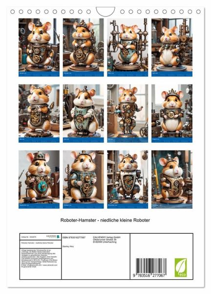 QUALITÄT - Hochwertiger Fotokalender mit 12 wunderschönen Motiven auf lichtbeständigem Bilderdruckpapier, robuste Spiralbindung mit Aufhängebügel.NACHHALTIG - deutliche Abfallreduzierung durch bedarfsgerechte Einzelstückfertigung, umweltfreundliches FSC-zertifiziertes Papier, Produktion in Deutschland, klimabewusste Logistik.PERFEKTES GESCHENK - Kalender für Freunde und Familie, für Kinder und Erwachsene, jung und alt, zu Weihnachten, Geburtstag oder zwischendurch.VIELFALT - Bildkalender in verschiedenen Formaten, z.B. DIN A5, DIN A4, DIN A3 sowie DIN A2. Ob Naturmotiv, Gemälde oder Fotos, ideal für ein persönliches Wohlfühlambiente.Entdecken Sie niedliche Roboterhamster in ihrer Werkstatt, bestehend aus faszinierenden mechanischen Bauteilen. von Autor(in): Stanley Hinz