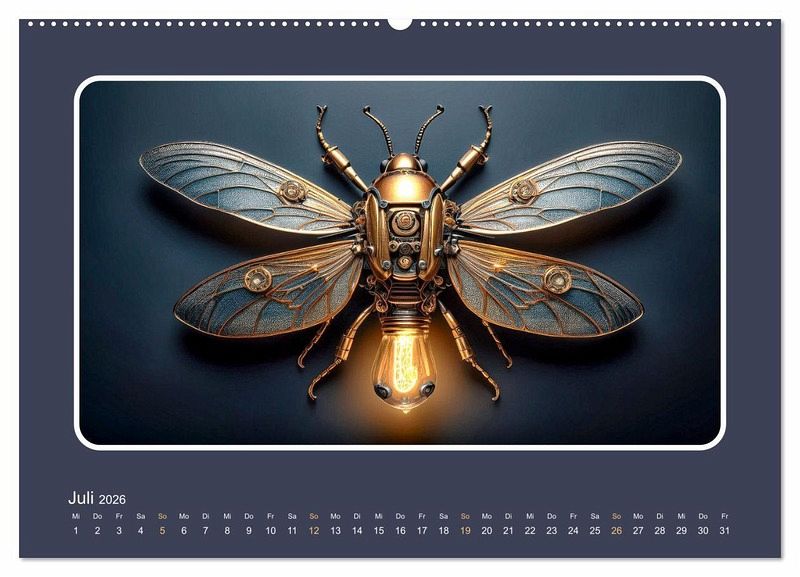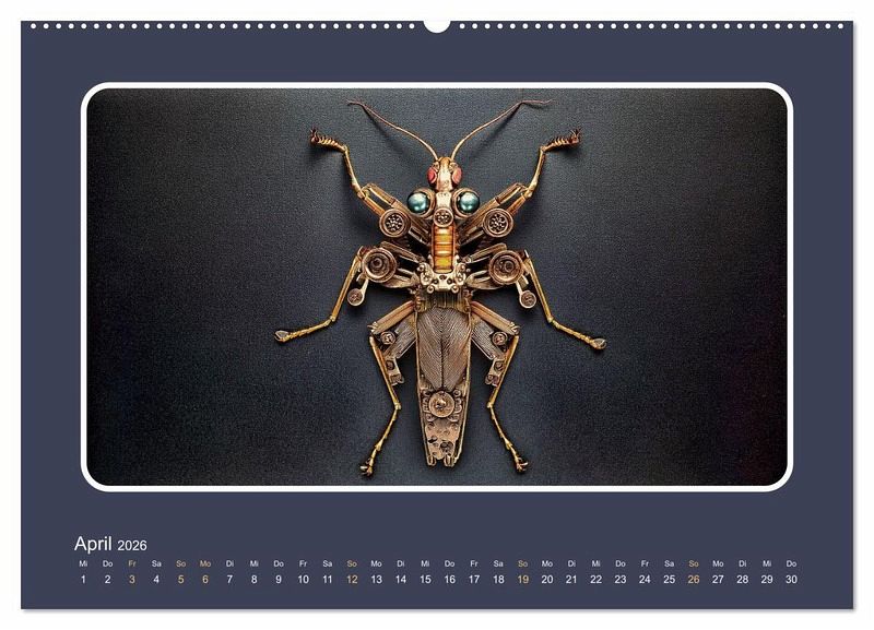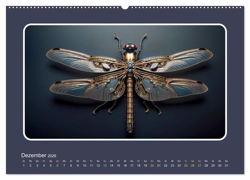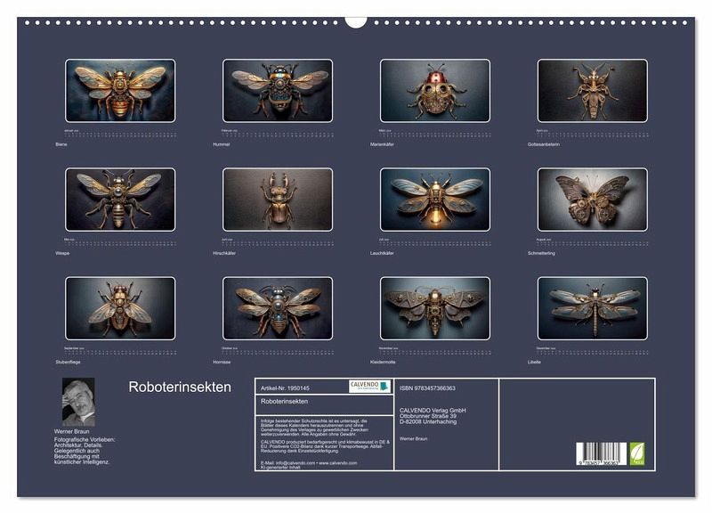 Die menschliche Forschung hat sich schon immer vieles von der Natur abgeschaut. Auch wenn es dabei vor allem um die Funktionalität geht, ist es doch faszinierend, sich vorzustellen, wie künstliche Insekten aussehen könnten. Unser Kalender entführt Sie in eine gedachte Welt, in der Maschinen die Natur imitieren. Hochrealistische Illustrationen, geschaffen von einer künstlichen Intelligenz, zeigen Ihnen jeden Monat ein anderes, mechanisches Insekt. Ein Kunstwerk für alle Technik- und Naturliebhaber!