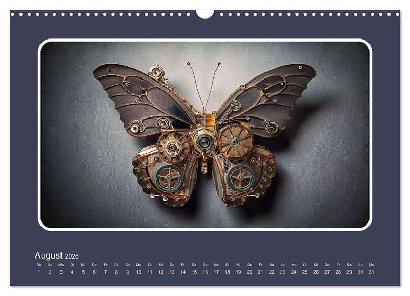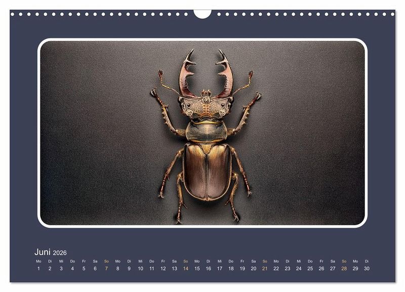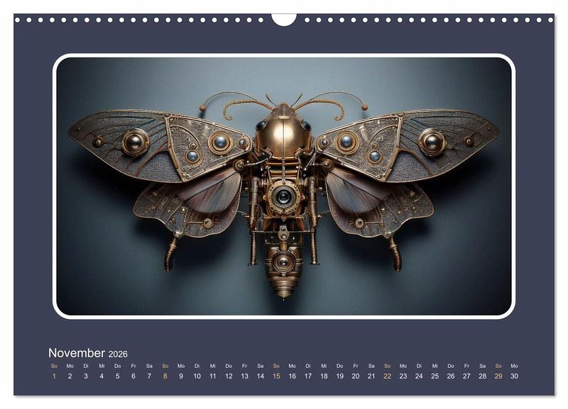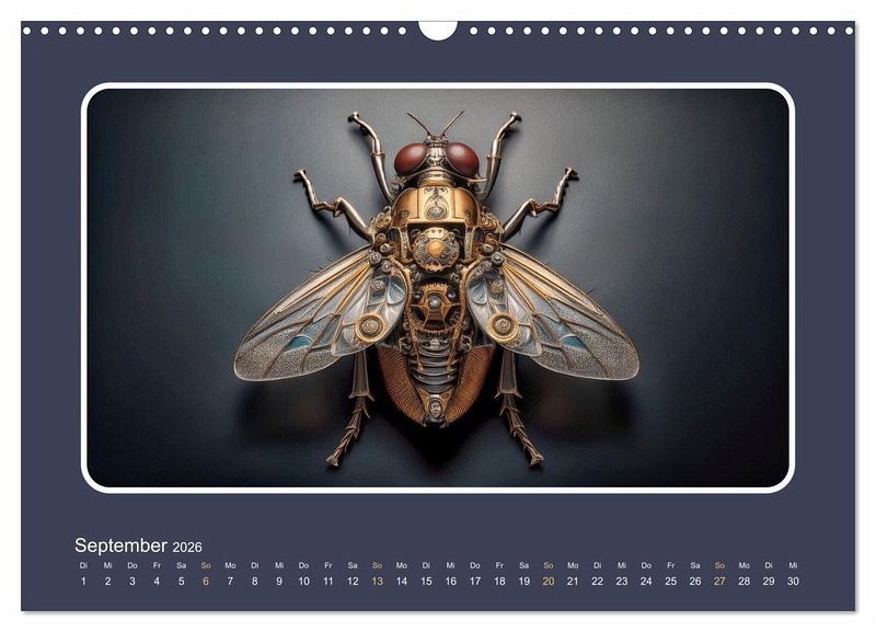 Die menschliche Forschung hat sich schon immer vieles von der Natur abgeschaut. Auch wenn es dabei vor allem um die Funktionalität geht, ist es doch faszinierend, sich vorzustellen, wie künstliche Insekten aussehen könnten. Unser Kalender entführt Sie in eine gedachte Welt, in der Maschinen die Natur imitieren. Hochrealistische Illustrationen, geschaffen von einer künstlichen Intelligenz, zeigen Ihnen jeden Monat ein anderes, mechanisches Insekt. Ein Kunstwerk für alle Technik- und Naturliebhaber!
