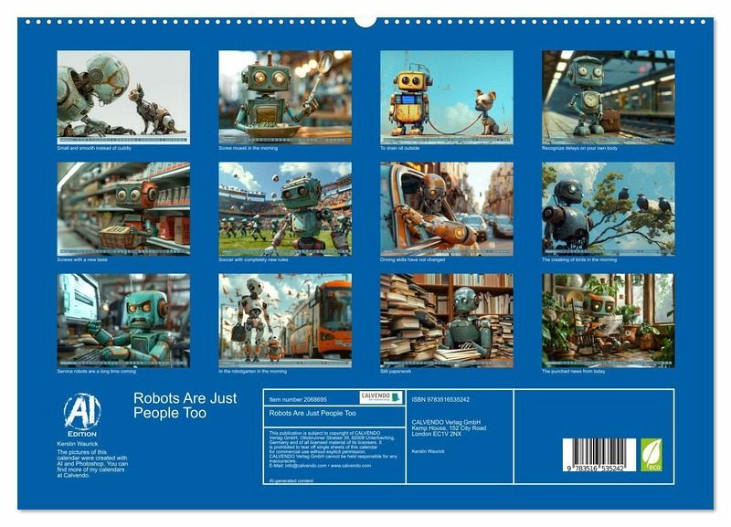 PREMIUM COLLECTION - Brilliant photo calendar with 12 beautiful motifs, high-gloss art print in museum quality.QUALITY - high-quality materials, sturdy back cover with 2 innovative insert pockets for optimum presentation on the wall.SUSTAINABLE - significant reduction in waste thanks to customised one-off production, environmentally friendly FSC-certified paper, production in Germany, climate-conscious logistics.PERFECT GIFT - calendars for friends and family, for children and adults, young and old, for Christmas, birthdays or in between.AI-driven comedy for everyday robot life von Autor(in): Kerstin Waurick