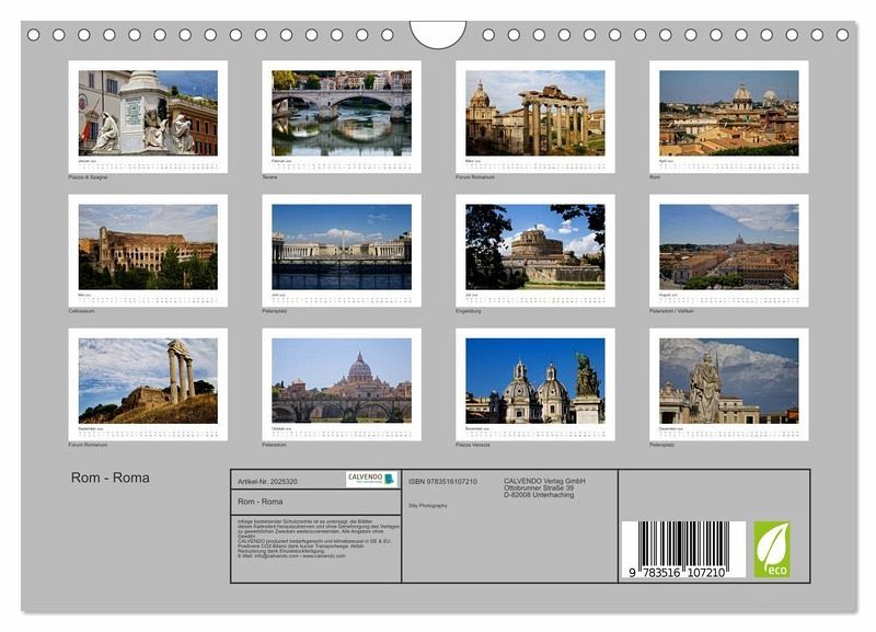 QUALITÄT - Hochwertiger Fotokalender mit 12 wunderschönen Motiven auf lichtbeständigem Bilderdruckpapier, robuste Spiralbindung mit Aufhängebügel.NACHHALTIG - deutliche Abfallreduzierung durch bedarfsgerechte Einzelstückfertigung, umweltfreundliches FSC-zertifiziertes Papier, Produktion in Deutschland, klimabewusste Logistik.PERFEKTES GESCHENK - Kalender für Freunde und Familie, für Kinder und Erwachsene, jung und alt, zu Weihnachten, Geburtstag oder zwischendurch.VIELFALT - Bildkalender in verschiedenen Formaten, z.B. DIN A5, DIN A4, DIN A3 sowie DIN A2. Ob Naturmotiv, Gemälde oder Fotos, ideal für ein persönliches Wohlfühlambiente.Rom - Roma - Die ewige Stadt von Autor(in): Silly Photography / Silvia Grimpe