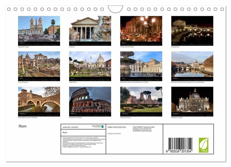 Dieser Kalender wurde mit dem Award "Top 100" ausgezeichnet. Rom wird gerne als die "Ewige Stadt" bezeichnet. Die Mischung zwischen kribbelnder Metropole und antiker Stätte macht diese Stadt so beliebt und fotogen. Während des Römischen Reiches erlebte Rom seine Blütezeit und hat bis heute seinen Glanz nicht verloren. Aus der Zeit des Römischen Reiches sind noch heute zahlreiche Sehenswürdigkeiten zu sehen. Das Kolosseum, das Forum Romanum, die Caracalla-Therme oder das Pantheon. Rom ist nicht nur immer eine Reise wert, sondern hat auch einen "ewigen" Platz an ihrer Wand durch einen Fotokalender verdient.